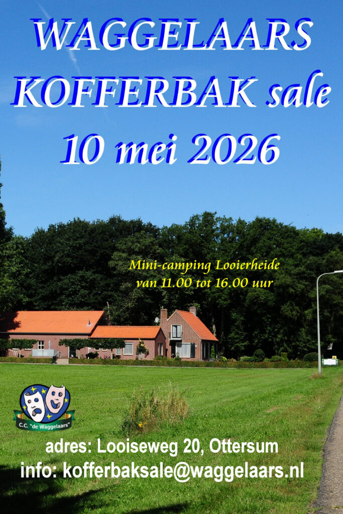 Op 10 mei 2026 gaat de 50 plus club, CC de Waggelaars uit Gennep, een Kofferbak sale organiseren op de camping de Looierheide aan de Looiseweg 20 in Ottersum. Wil je hierbij aanwezig zijn als deelnemer /verkoper, reageer dan zo spoedig mogelijk.